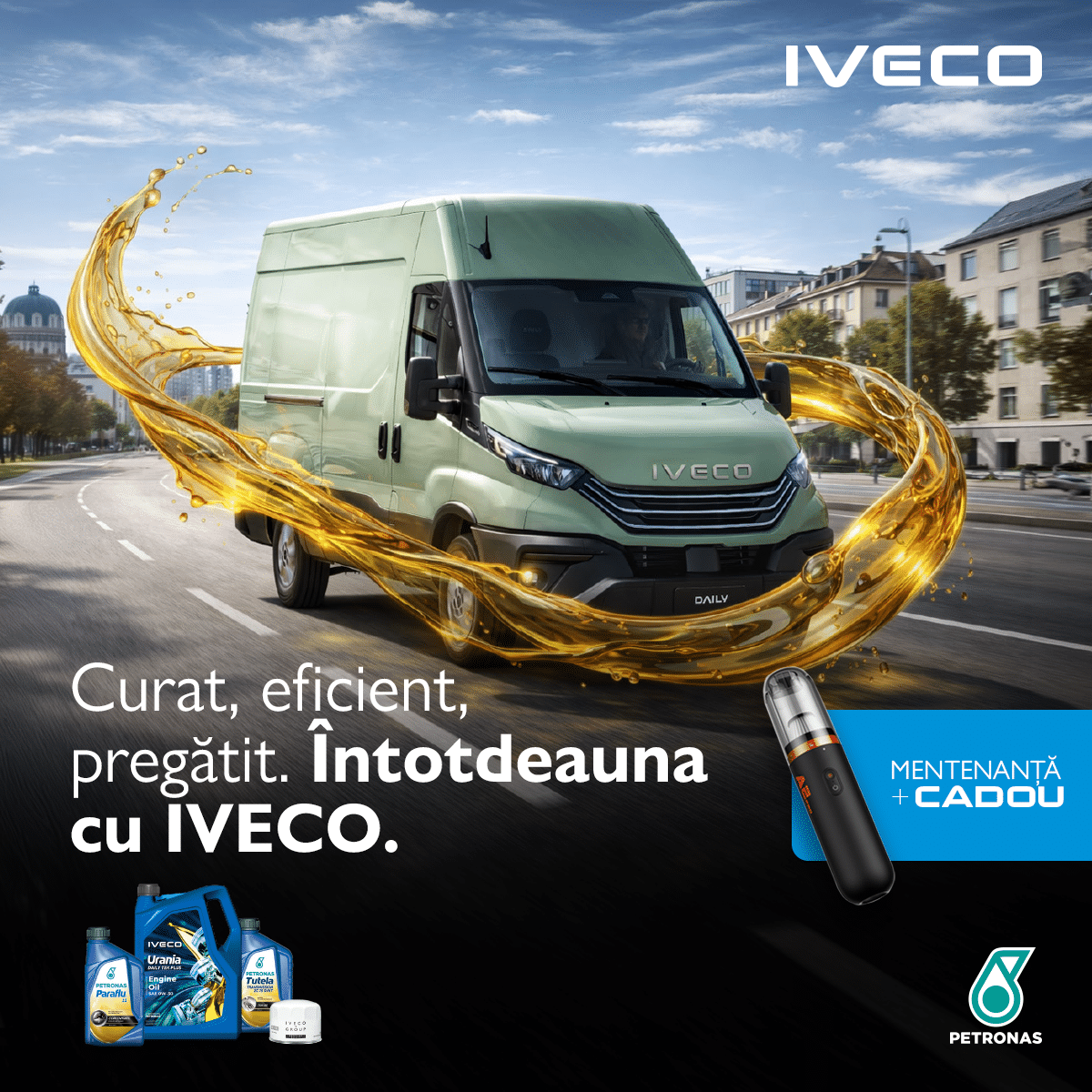 Campanie “Curat, eficient, pregătit. Întotdeauna cu IVECO“este oferta prin care poți primi un aspirator portabil 🎁 atunci când achiziționezi produse eligibile IVECO și PETRONAS și încarci factura online. Participarea este simplă, iar premiul este garantat pentru facturi conforme cu regulamentul campaniei.